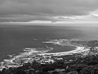 It was really quite beautiful. From the pipetrack above Camps Bay the ocean was charcoal and the clouds sagged with unrained rain above the dark sea. Then the rain came down like a silver curtain drawn quickly from the sea to the mountain.